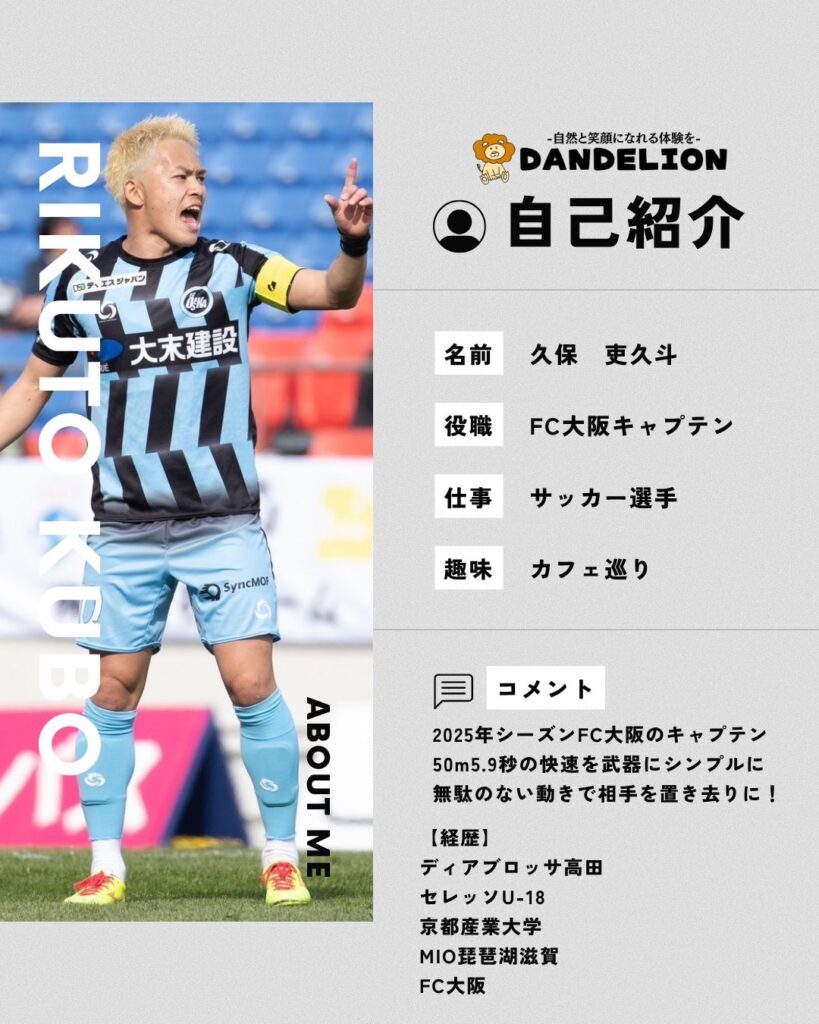 また、三木コーチの友人であり、現役のJリーガーでもあるFC大阪キャプテンの『久保 吏久斗選手』もスペシャルゲストとして参加して頂けます。